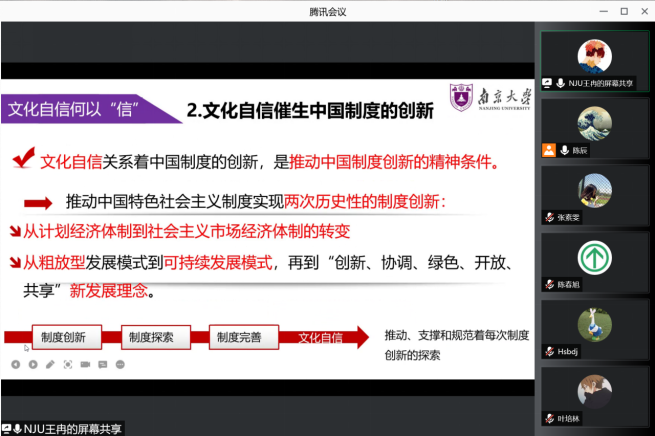 王冉同志首先介绍了毛泽东、邓小平、习近平等领导人在不同历史阶段中都强调文化自信的重要性及所产生的重大影响。进而,他总结了坚守文化自信的三个重要作用——奠定中国特色社会主义道路的选择,催生中国特色社会主义制度的创新,提升中国理论的国际话语权。