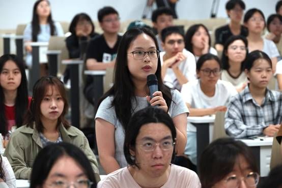 在国防科技大学学员们结束分享后,南京大学学子们举手提出了自己心中的问题:“我国国防实力进步主要得益于哪些方面?”“如何理解和践行‘吾辈自强’在当下的时代内涵?”“如何将阅兵中感受到的科技自信,转化为深耕专业、攻克国防科技难题的学习动力?”三个问题层层递进,从历史到当下再到未来,从认知到认同再到行动,构成了一个完整的思维链条,展现了南大学子深刻的问题意识和家国情怀。面对这些问题,国防科技大学的学员们结合自身的学习体会与专业认知,给予了系统而深入的回应。