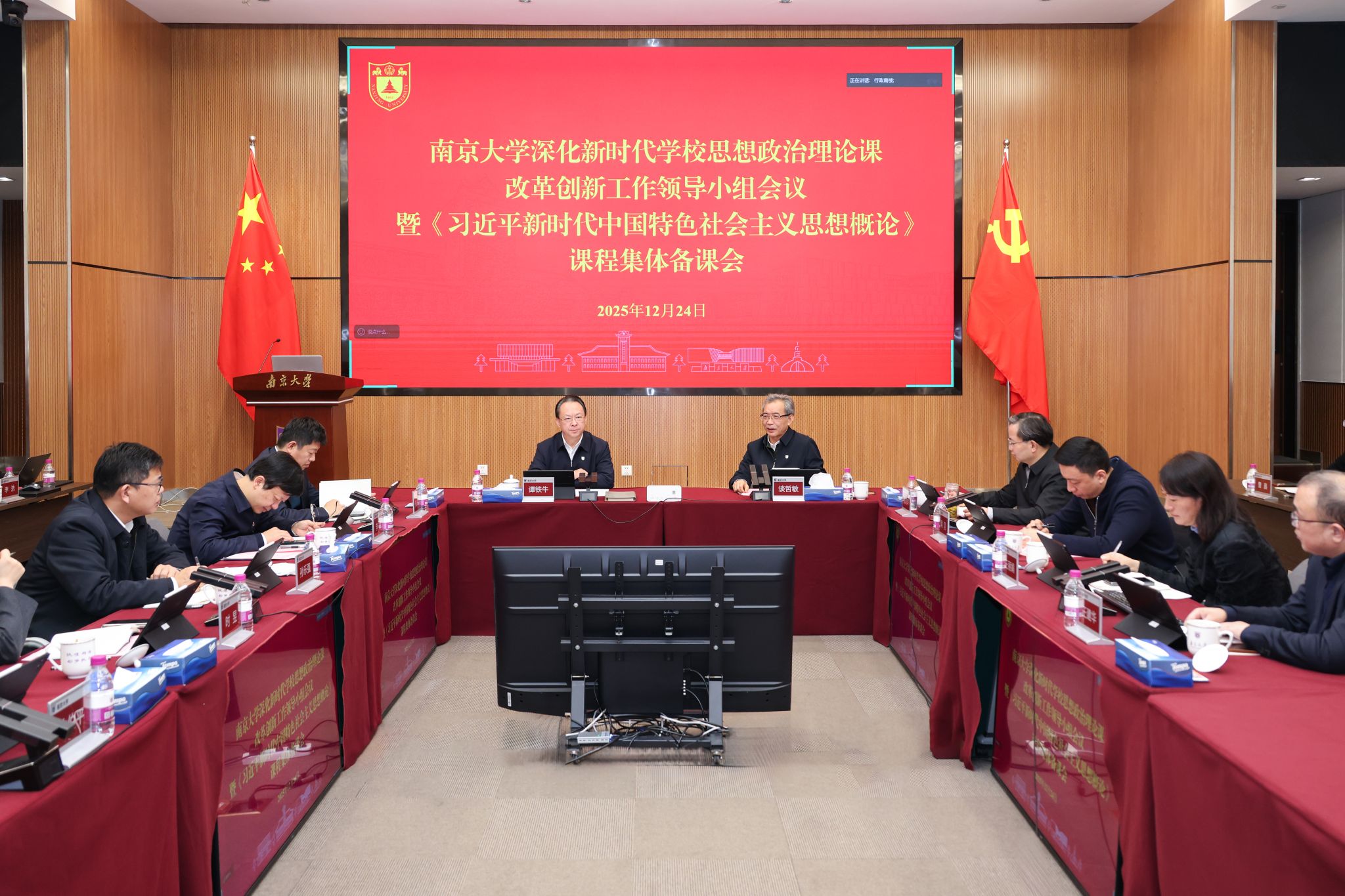 12月24日,南京大学召开深化新时代学校思想政治理论课改革创新工作领导小组会议,并开展《习近平新时代中国特色社会主义思想概论》课程集体备课。校党委书记谭铁牛主持会议并讲话,校长谈哲敏出席会议并讲话。