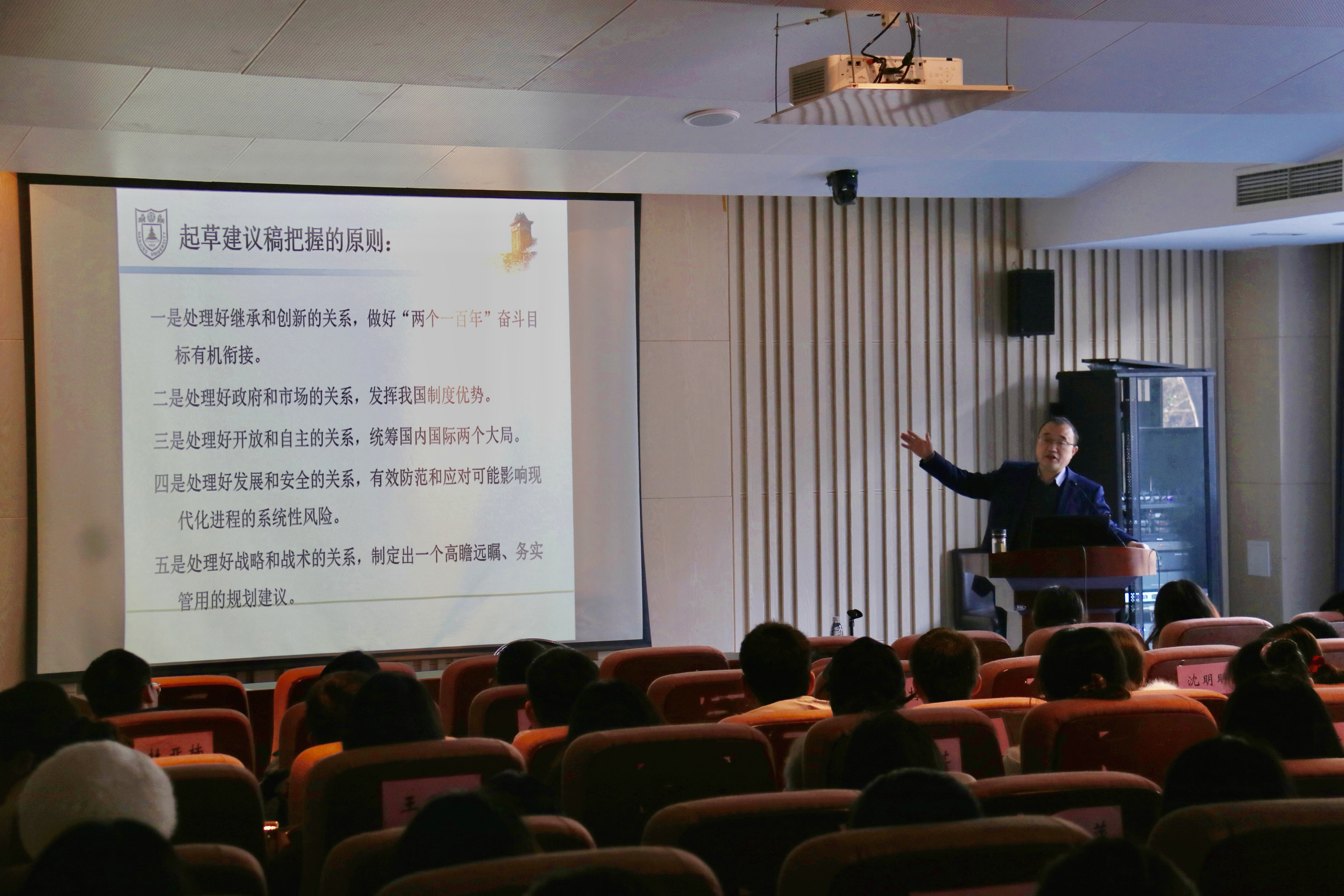 党委书记王建华教授在圣达楼101报告厅为学院全体党员学生进行了党的十九届五中全会精神解读,党委副书记时昱主持会议。