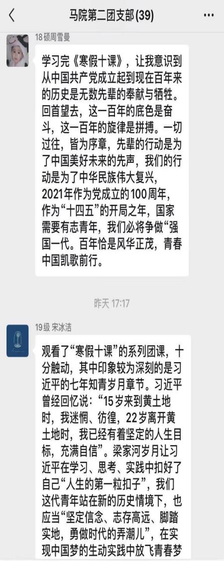 研究生第一、第二团支部通过微信群进行线上学习交流,支部团员撰写心得体会并进行分享。2020级硕士生第一团支部、第二团支部,2020级博士生团支部通过腾讯会议平台开展学生团员“寒假十课”学习交流会,支部成员结合生活实际、影视作品和家乡故事等内容,回顾“寒假十课”,分享学习心得体会。