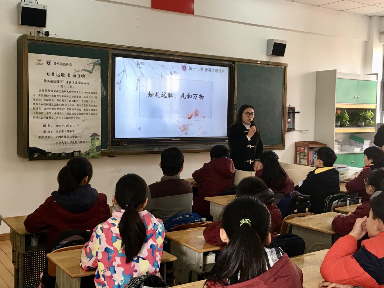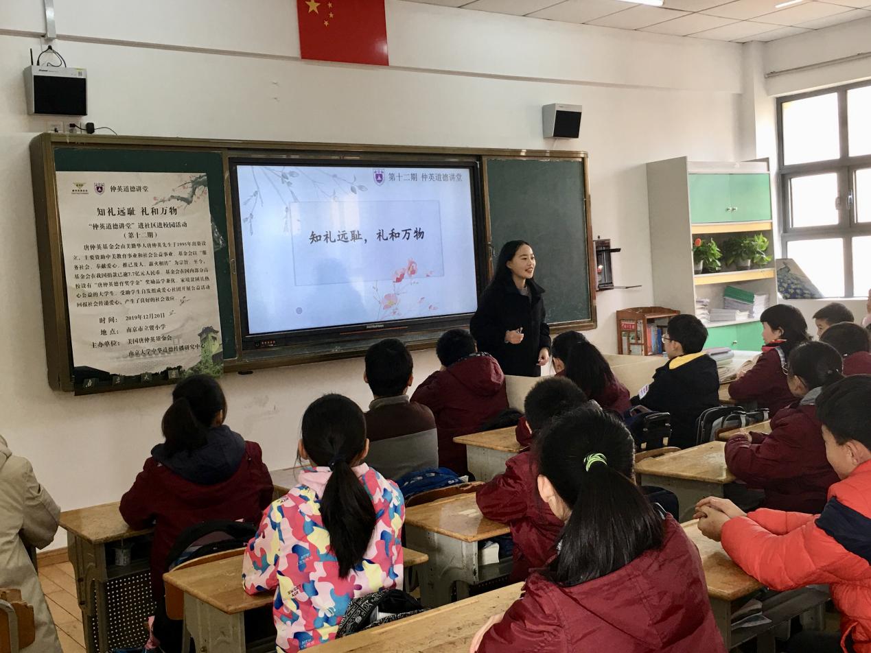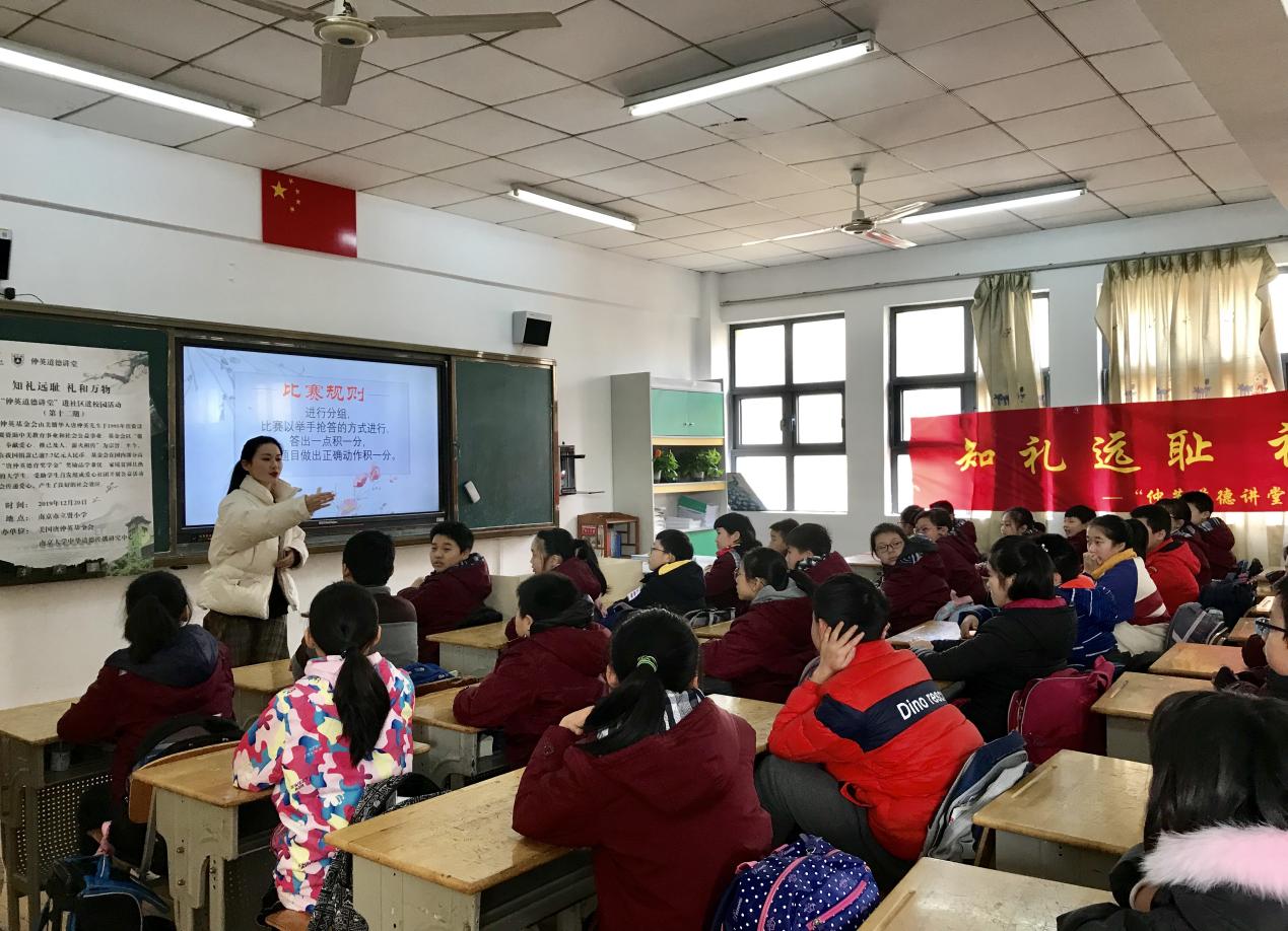 为弘扬中华美德,帮助小学生更好地践行文明礼仪,1220日,南京大学第十二期“仲英道德讲堂”进社区进校园活动于南京市立贤小学拉开帷幕。本次中华优秀传统道德讲堂活动以“知礼远耻,礼和万物”为主题,南京市立贤小学40余名师生踊跃参与其中,学习优秀传统礼仪,感悟中华文化魅力。