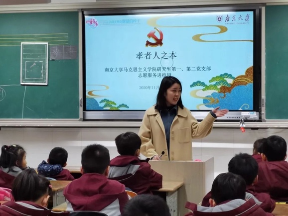 为响应党中央“参加一次志愿服务,为身边群众至少办一件实事好事”的号召,充分发挥高校在理论研究、政策解读、传承优秀传统文化方面的特色优势,传播中华民族优秀传统文化,推动“感念亲情,敬老爱亲”知识进小学,2020年11月27日下午1点,南京大学马克思主义学院研究生第一、二党支部走进立贤小学,成功开展了第二期的志愿服务活动,为立贤小学1年级1班45名学生带来了一堂别开生面的“感念亲情,敬老爱亲”课堂。