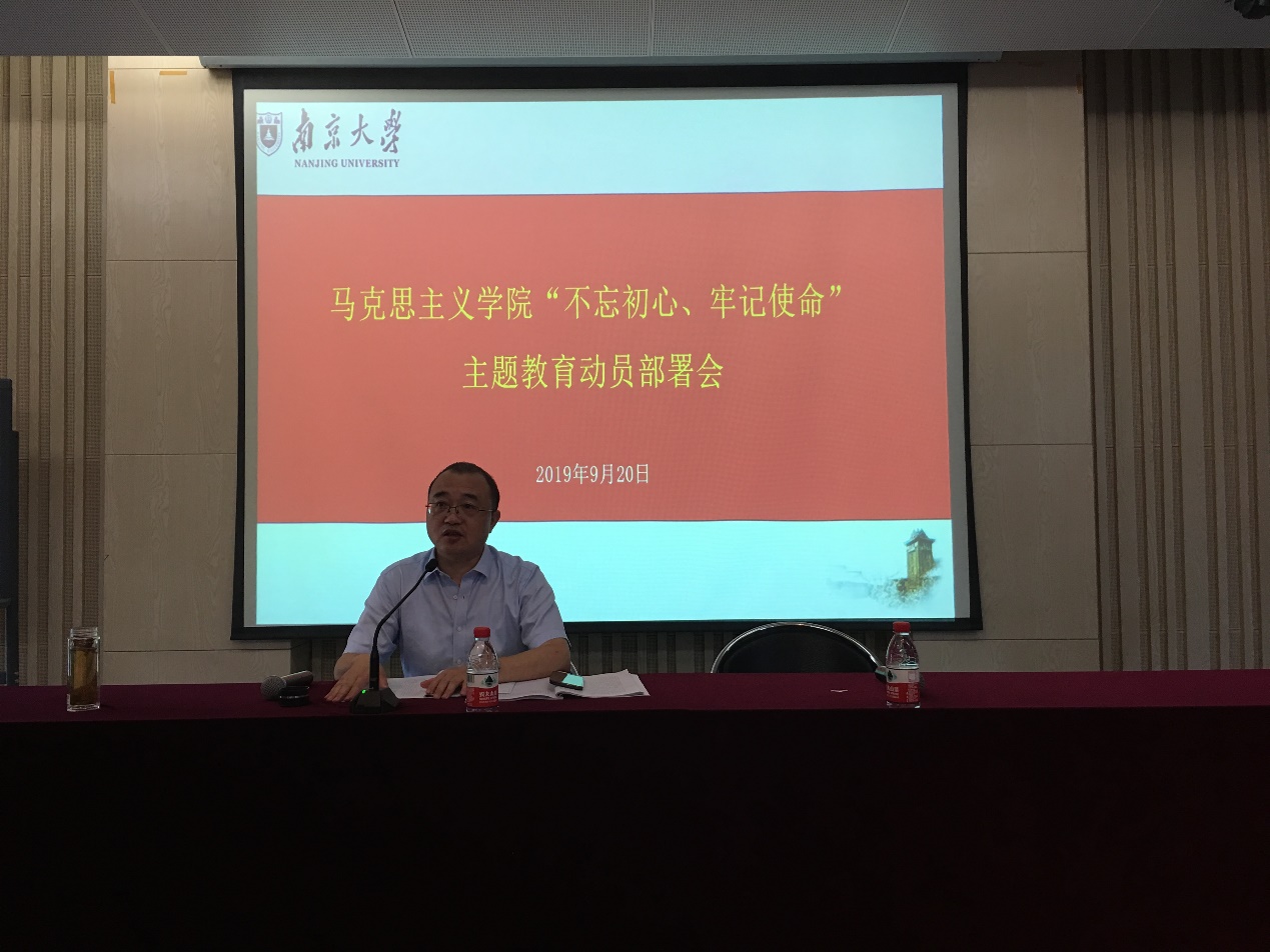 会上,学院党委书记王建华向全体成员传达了“不忘初心,牢记使命”主题教育的精神。他重点解读了习近平总书记在中央党校中青年干部培训班开班式上发表的重要讲话和中共中央《关于开展第二批“不忘初心、牢记使命”主题教育的指导意见》,并向学院所有党员同志传达了9月11日校党委书记胡金波在南京大学“不忘初心、牢记使命”主题教育动员会上的讲话精神。王建华书记指出,为让主题教育活动往深里走、往心里走、往实里走,学院党委特成立“不忘初心、牢记使命”主题教育领导小组。王建华书记宣读了学院成立“不忘初心、牢记使命”主题教育领导小组的通知并梳理了主题教育活动的工作要点,就学院领导班子和基层党支部、党员同志分别提出要求与期待。主题教育自9月始,11月底基本结束。期间学院领导班子需完成成立领导小组及办公室、召开主题教育动员大会、制定个人学习计划、开展集中学习研讨等12项任务;党支部和党员需在学院党委指导下完成专题党课、志愿服务、民主评议等11项任务。王建华书记将主题学习的时间表和规划图,清晰地传达给全体党员,并特别强调主题教育活动注重统筹结合,需与新中国成立70周年大庆结合起来,与学院融合党建工作结合起来,结合实际抓实效。王建华书记对全体党员同志提出希望:希望每一位党员同志都能主动、积极地投身主题教育,锤炼忠诚担当的政治品格,在新时代下不忘我党的初心、更加自觉地承担共产党员的职责与使命。