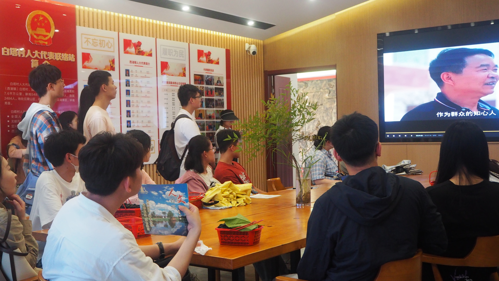 深入馆内,白塔村党支部的治理理念与建设成果以展板的形式呈现在同学们的眼前。白塔村党支部充分发掘白塔村的资源禀赋与人文底蕴,放大乡村“旅游+”效应,将白塔村打造成生活富裕、生态宜居的美丽乡村。在村庄发展中,白塔村真正做实了党建引领,首创“四邻联动”制度,1名党员对接4户群众,通过一帮一、一帮多的模式,号召村民们都参与到乡村治理工作当中。此外,白塔村重视发挥人大代表联络站的作用。白塔村代表联络站是无锡市先行建设的示范“家站点”之一,站内分接待、展示等功能区,自常态化运行以来取得了显著成效,发挥了接地气、察民情、聚民智、惠民生的积极作用。