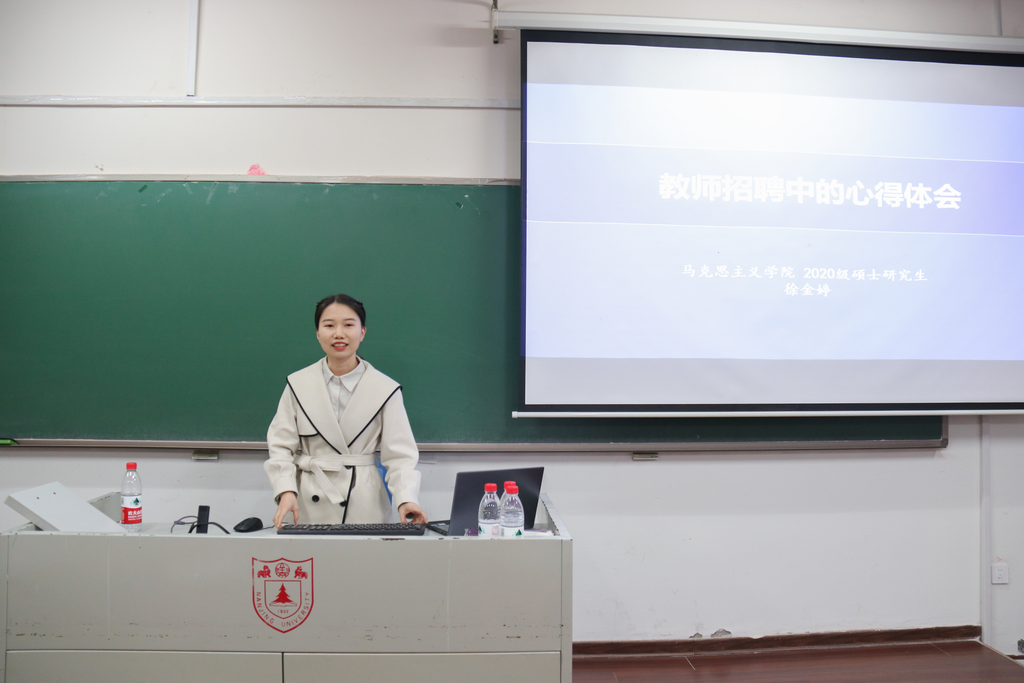 2020级马克思主义基本原理专业的何鑫乐学长及思想政治教育专业的徐金婷学姐进行分享,会议由董梦圆同学主持。两位学长学姐从招考条件、信息获取、择校考量及笔面试准备等方面,对中学教师招聘进行多维分析,向参会同学传授求职经验。在结构化面试模拟环节,两位学长学姐通过一对一面试辅导的方式,在实战演习中传授面试技巧。