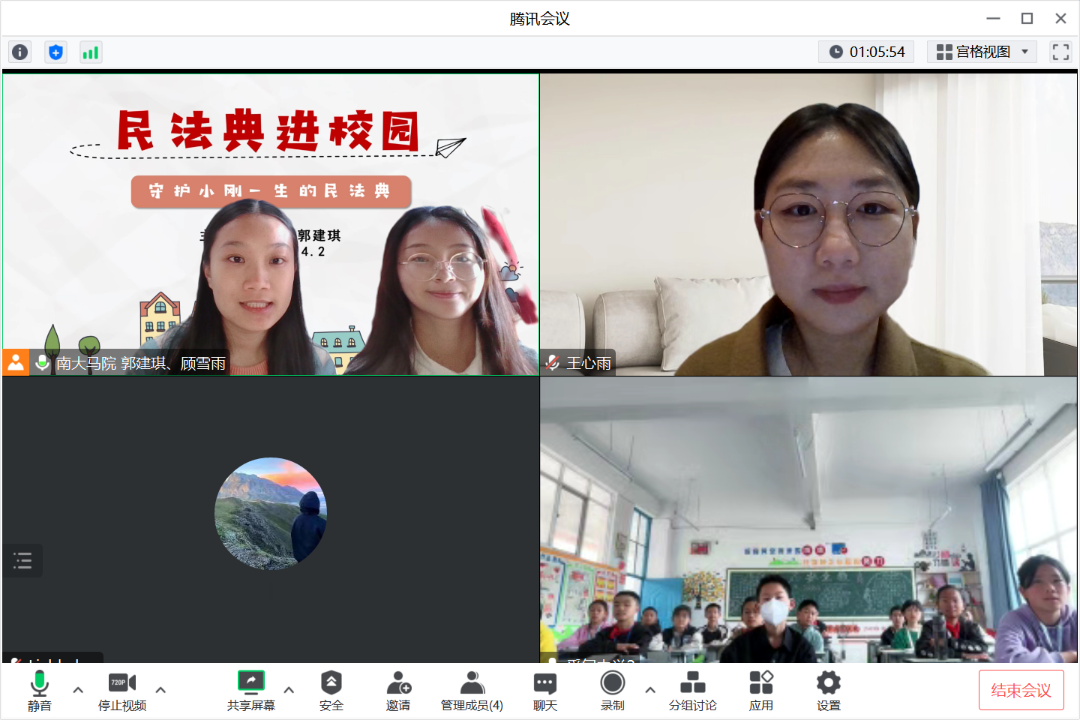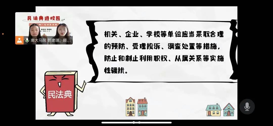 最后顾雪雨和郭建琪带领同学们一起回顾了“小刚”的一生,重温了课上的法律知识,感悟《民法典》对我们人生各个时期保驾护航的作用,呼吁同学们要“知法、学法、用法、守法,用法律武器捍卫我们自己的合法权益。”