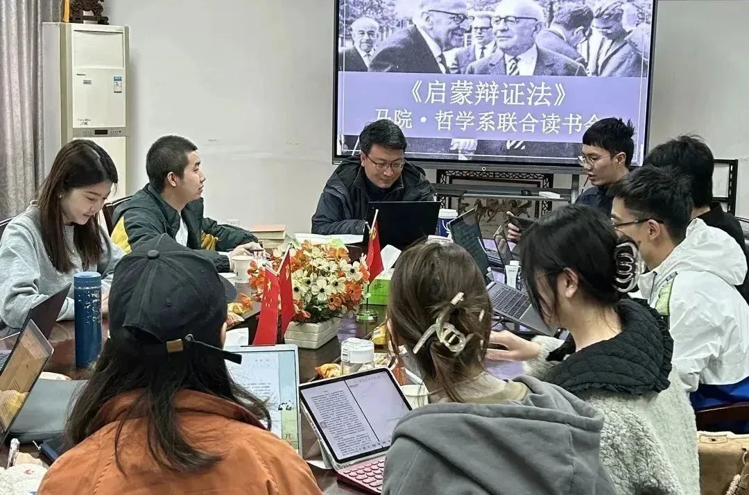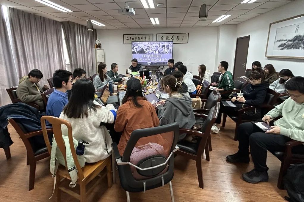 3月26日下午,南京大学马克思主义学院研究生会和哲学系研究生会于哲学系楼325教室联合举办了主题为“重回启蒙的概念”的读书会活动。本次读书会所阅读的书目是法兰克福学派的霍克海默和阿多诺合写的《启蒙辩证法》,活动邀请了马克思主义学院李乾坤副教授现场领读讲解,来自马院、哲学系及其他院系的近20位同学参与讨论。