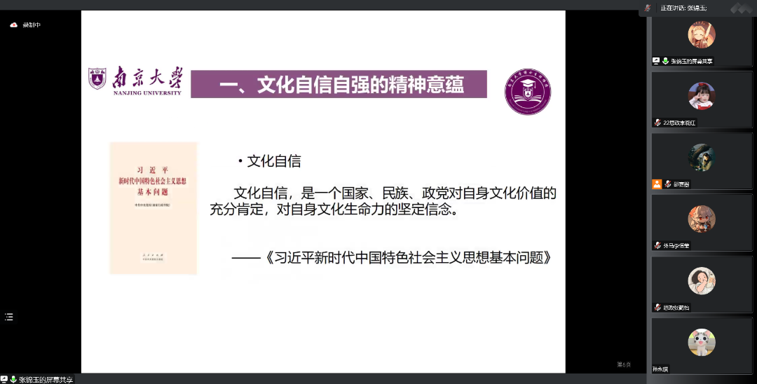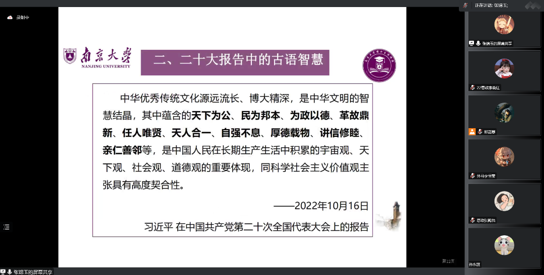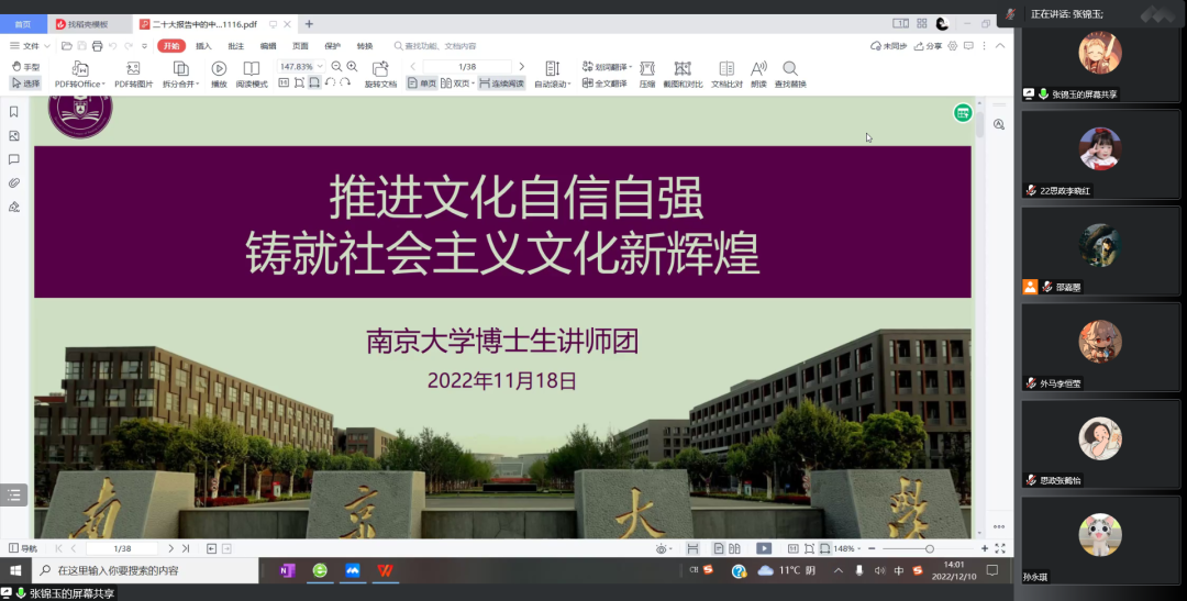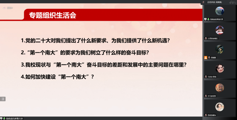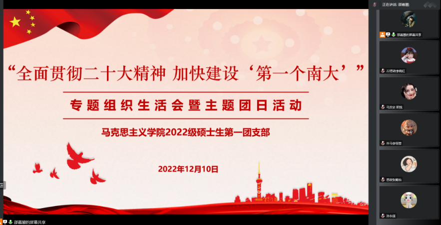 为深入学习宣传贯彻党的二十大精神和习近平新时代中国特色社会主义思想,全面落实习近平总书记给我校留学归国青年学者的重要回信精神和学校党委“全面贯彻二十大精神 加快建设‘第一个南大’”大讨论相关要求,坚持立德树人根本任务,2022年12月10日,马克思主义学院2022级硕士生第一团支部开展“全面贯彻二十大精神 加快建设‘第一个南大’”专题组织生活会暨主题团日活动,通过全员参与、广开言路,聚焦问题、建言献策,充分讨论、集思广益,不断增强共青团组织引领力、组织力、服务力,进一步引领班级青年参与建设有中国特色、南大特质、时代特点的“第一个南大”。本次活动采用线上形式,由2022级硕士生第一团支部书记邵嘉曌、副书记周甫森、组织委员张睿思共同主持,南京大学博士生讲师团张锦玉作为特邀嘉宾进行主题宣讲。