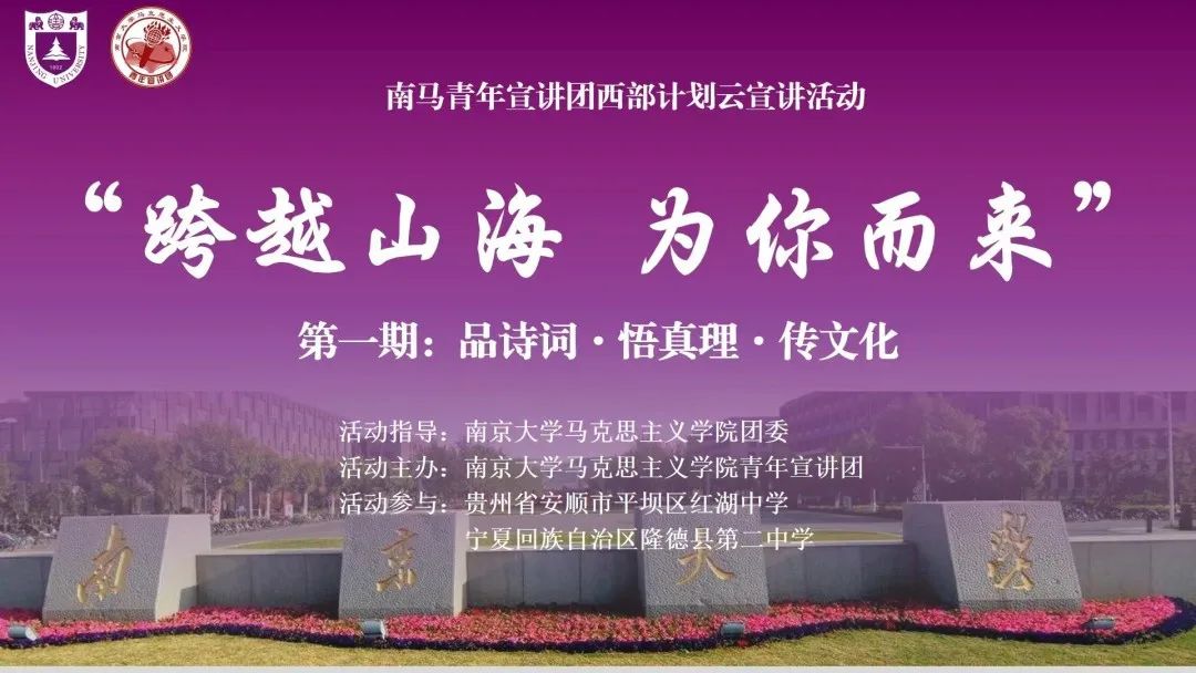 为深入学习宣传贯彻党的二十大精神和习近平总书记关于青年工作的重要思想,培养有理想、敢担当、能吃苦、肯奋斗的新时代好青年,在积极投身祖国西部学生的成长中弘扬青年奉献精神、践行青年时代使命,南京大学马克思主义学院青年宣讲团在精心筹备后开展了“跨越山海 为你而来”西部计划云支教系列活动,以继承传统——立足当下——展望未来为主线,助力南马青年与西部青少年沟通交流,把更多特色鲜明、丰富多样的内容带进西部地区中小学课堂。