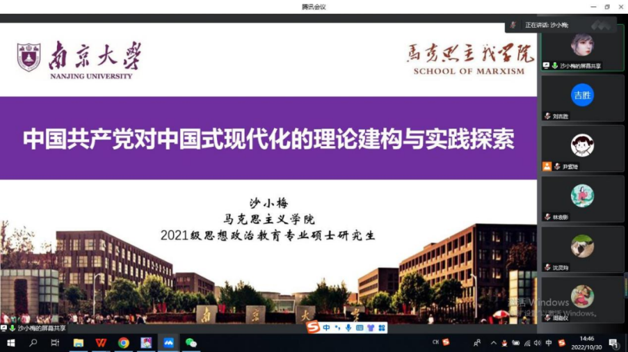 硕士生第二党支部开展“再踏层峰辟新代,更扬云帆立潮头——二十大精神集体学习”线上主题党日活动。本次活动由硕士生第二党支部书记尹紫琦主持,南京大学马克思主义学院青年宣讲团讲师沙小梅作为特邀嘉宾进行主题宣讲。
