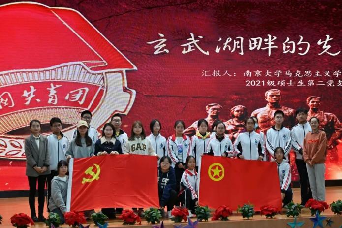 为认真贯彻落实习近平总书记关于抓好青少年学习教育,让红色基因、革命薪火代代传承的重要指示精神,培育广大青少年学生在心中厚植爱党、爱国、爱社会主义的情感,2022年10月10日上午,马克思主义学院2021级硕士生第二党支部与南京市第十三中学联合开展“喜迎二十大,奋进新征程”系列党日活动第1期:教育专题——党史宣讲进校园。支部成员张沁园同志作“玄武湖畔的先声”主题宣讲,十三中全体师生与肉视频