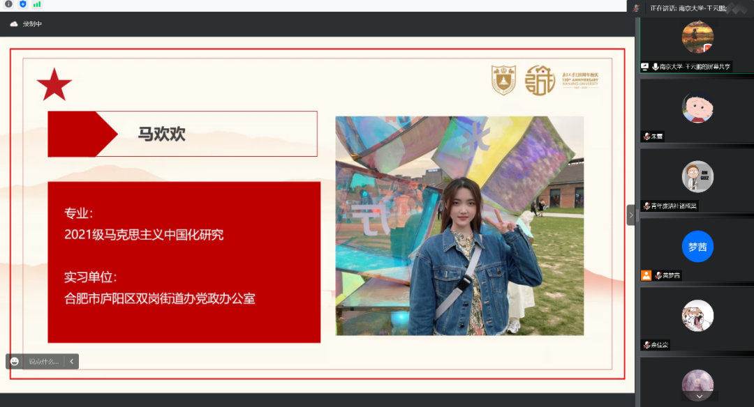第三个环节,由南京大学马克思主义学院2021级硕士生第二党团支部党员进行暑期社会实践第4期汇报展示。本次汇报的党员是第五组的三位同志,他们利用假期时间,在不同的政务工作岗位上认真锻炼,在不同的地方基层上积极调研,彰显出南大学子的青年担当。