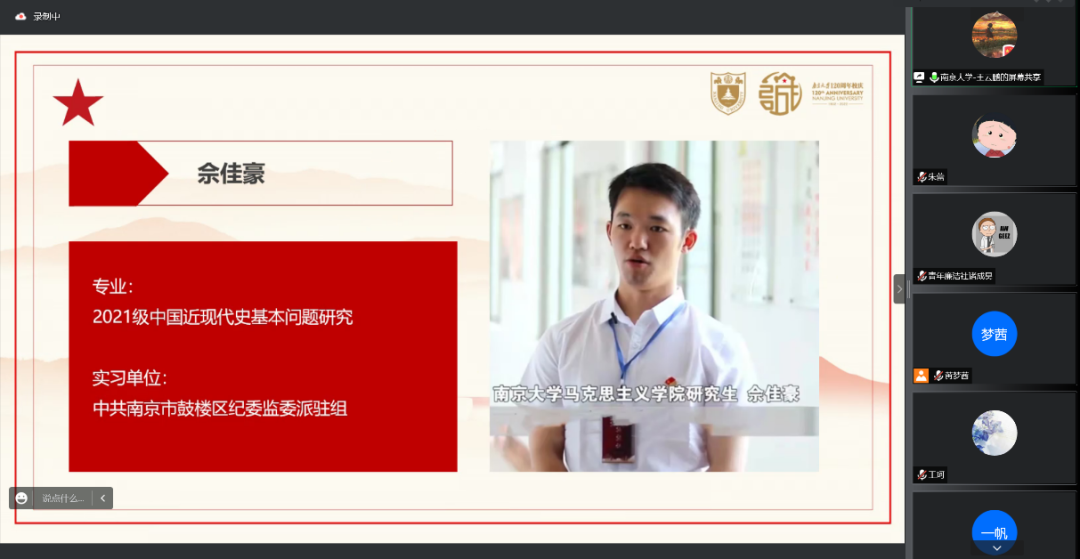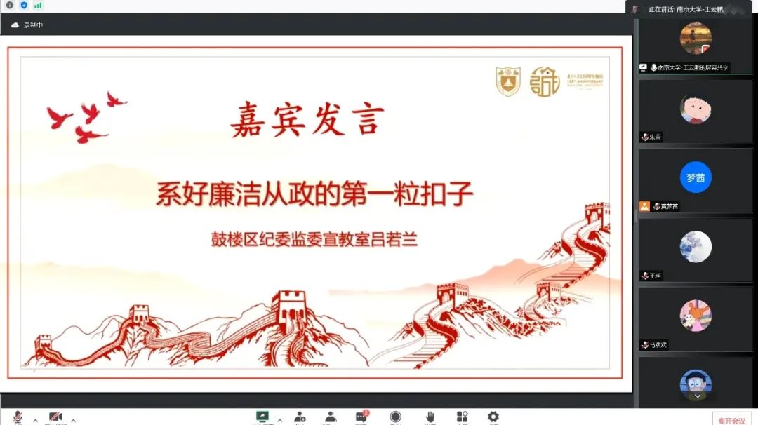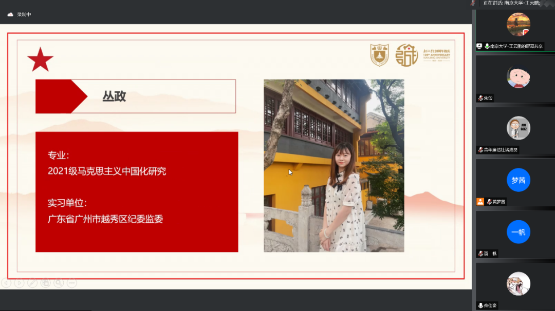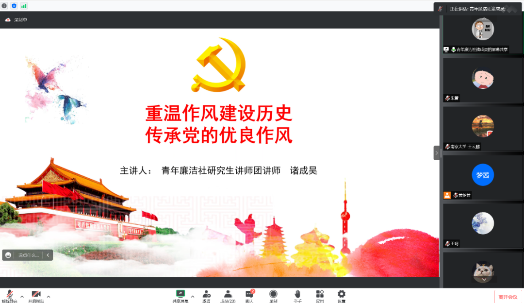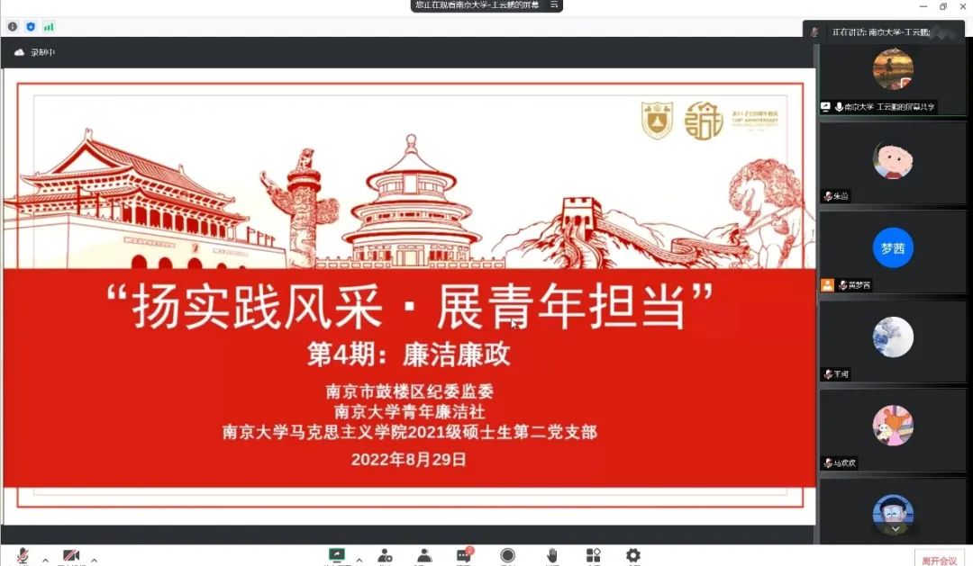 “青年者,国家之魂。”青年崇廉尚洁、严以律己,国家就能正气充盈、永葆青春活力。习近平总书记在庆祝中国共产主义青年团成立 100 周年大会上指出,要涵养廉洁自律的道德修为,心有所畏、言有所戒、行有所止,不断锤炼意志力、坚忍力、自制力,做一个一心为公、一身正气、一尘不染的人。为深入学习习近平总书记关于廉洁廉政工作重要指示精神,引领新时代中国青年扣好廉洁自律的“第一扣”、系好廉洁自律的“安全带”,2022年8月29日晚,马克思主义学院2021级硕士生第二党支部与南京市鼓楼区纪委监委、南京大学青年廉洁社联合开展“扬实践风采,展青年担当——2021级硕士研究生第二党支部暑期主题党日活动第4期‘廉洁廉政’实践风采展示。”会议由2021级硕士生第二党支部成员王云鹏同志主持。