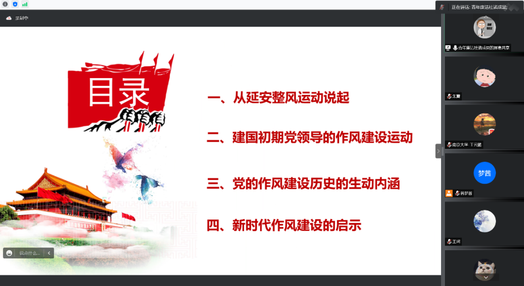 随后,南京大学青年廉洁社研究生讲师团讲师诸成昊同学作“重温作风建设历史,传承党的优良作风”主题宣讲。他从延安整风运动说起,通过建国初期党领导的作风建设运动、党的作风建设历史的生动内涵、新时代作风建设的启示三个板块为大家梳理了党的作风建设的历史经验与现实。以建国初期的五次作风建设运动为线索,通过讲述毛泽东与黄炎培的“窑洞对”和西柏坡会议“两个务必”精神等生动内涵,使同志们认识到我们党的作风建设作为一项伟大工程对于党的建设的重要意义。最后,诸成昊同学总结了新时代作风建设的四点启示:把握作风建设的宝贵经验、传承理论联系实际的作风、密切联系人民群众的作风、积极开展自我批评的作风。历史启示我们,只有不忘初心,牢记来时路,才能理清思想之迷雾,不断提高坚持发展中国特色社会主义的能力。