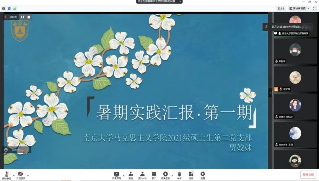 活动伊始,由南京大学马克思主义学院2021级硕士生第二党支部党员进行暑期实习实践第1期汇报展示。