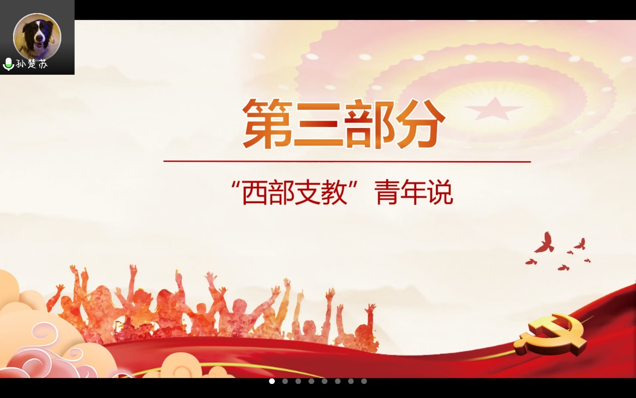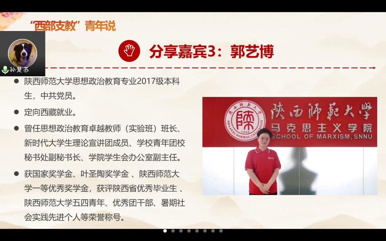 港台青年与内地青年同根同源,拥有共同记忆和相似的文化背景,在祖国更广阔的大地上,也有这样一群青年选择响应党和国家的号召,扎根西部,奉献自己。党日活动的第三部分由两位赴西藏和宁夏支教的同学分享他们的理想之路。陕西师范大学马克思主义学院2021届毕业生郭艺博当前正于西藏从事教育工作,从前期的紧张忐忑,对当下充满未知感,到深入实践,行知感受,克服对未来的无力感,再到投身支教,心怀热勇,践行生命的意义感,她坚持用自己的身体力行去实现“贴近大地,行以致远,到西部去,到基层去,到祖国最需要的地方去”的人生理想,使支部成员认识到了个人价值追求与祖国需要、祖国复兴使命的交融。