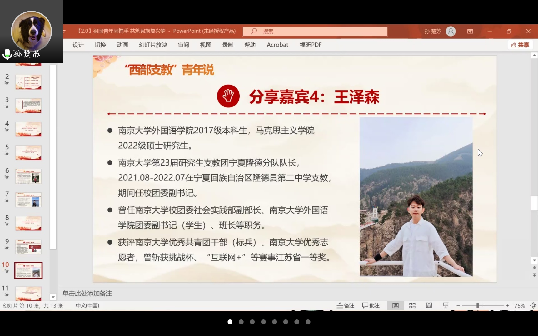 南京大学马克思主义学院2022级硕士研究生王泽森曾带领南京大学第23届研究生支教团宁夏隆德分队开展支教活动,他从“教学一线立德树人”、“五育并举融合育人”、“捐资助学励志启人”、“影响广泛成果喜人”四个方面分享自己的支教经历,在支教活动中阅社情、知国情,长见识、增才干,为祖国西部发展贡献自己的青年力量。