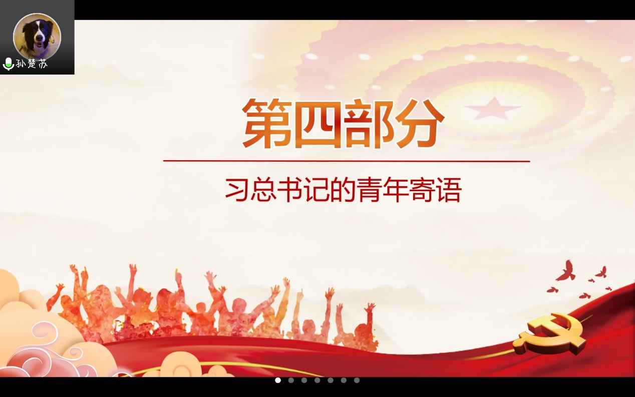四位同学分享完毕后,两支部成员共同观看视频,感悟习总书记的青年寄语,深刻了解步入新时代,习近平总书记立足于确保党的事业薪火相传、确保中华民族永续发展的深远考虑,始终将青年和青年工作摆在民族复兴的坐标上,从确保党的事业薪火相传和中华民族永续发展的战略高度,深刻把握新时代中国青年运动规律,加强党对青年工作的领导,为做好新时代党的青年工作指明了前进方向、提供了根本遵循。
