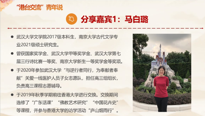 党日活动的第二部分主要由曾赴香港和台湾进行交流的同学分享属于他们的青年故事。南京大学古代文学专业2021级硕士研究生马白璐同学于2019年秋季学期前往香港大学进行交换,她结合自己在香港的求学经历、生活经历,从日常生活、研究学习和情感体验上深切感受到香港回归后发生的诸多可喜变化,并对香港朝气蓬勃的未来发展满怀期待。
