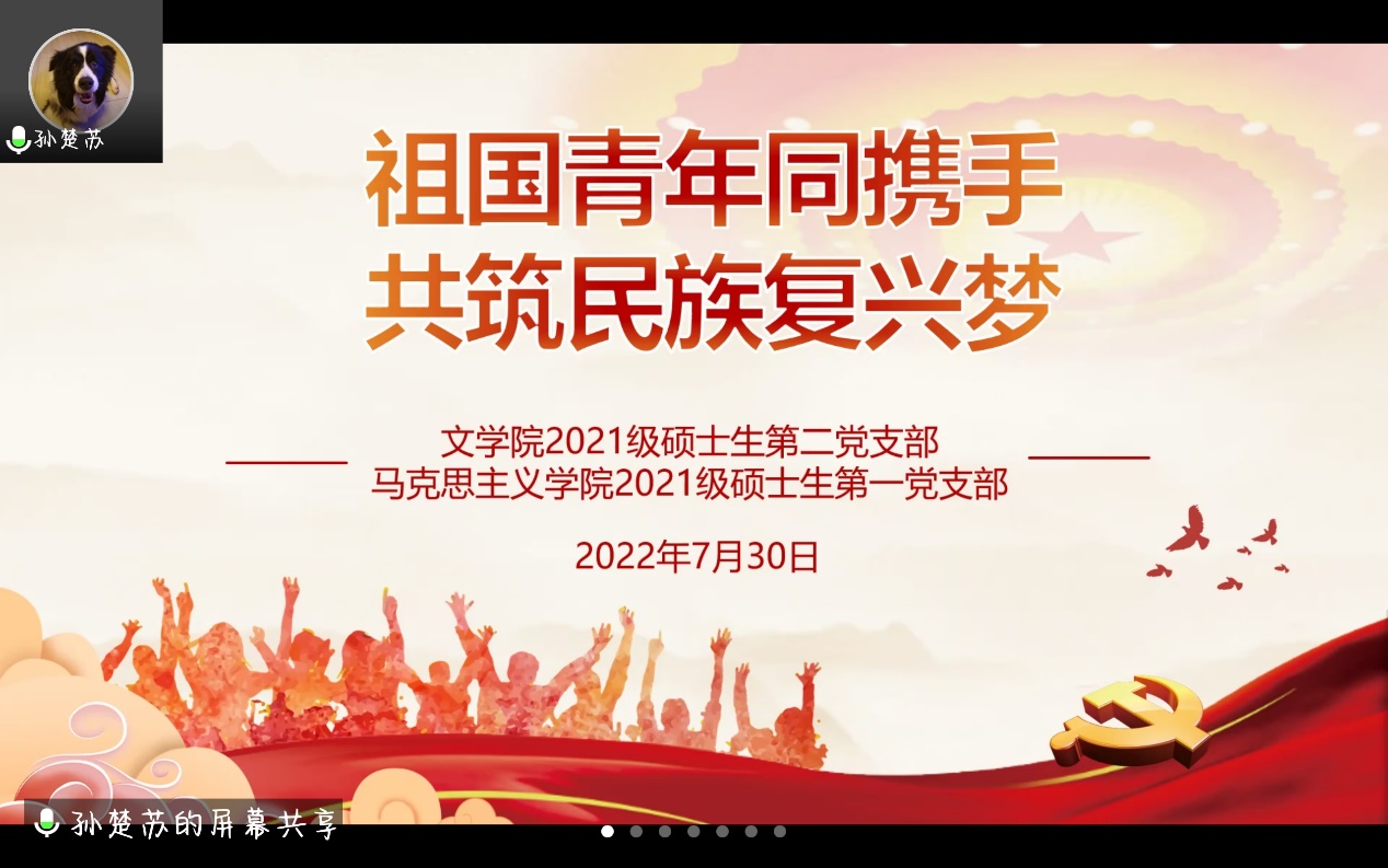 2021级硕士生第一党支部联合文学院2021级硕士生第二党支部于2022年7月30日晚七点共同开展“祖国青年同携手,共筑民族复兴梦”主题党日活动。通过讲述青年奋斗故事,展现青年理想担当,激励青年扎根祖国大地,为实现民族复兴梦而不懈奋斗。本次党日活动由肉视频