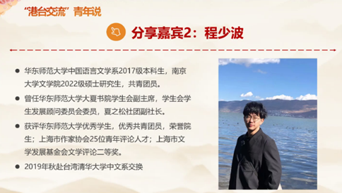 南京大学文学院2022级硕士研究生程少波曾于2019年秋赴台湾清华大学中文系交换,虽然台湾的基础设施及学术研究与大陆存在一定差距,但他仍能真切感受到当前绝大部分台湾青年对大陆文化的殷切期待,对两岸团结统一的认可与支持,相信两岸青年能够进一步加强沟通与理解,共筑祖国美好未来。