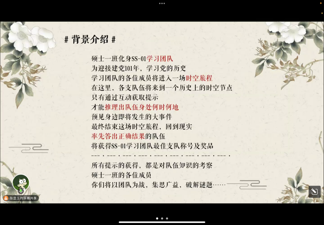 活动伊始,第四党小组成员张显玉同志为我们介绍了活动的整体流程和环节设置。本场活动以“时空之旅”剧本游戏的形式开展。在这场旅程中,支部成员穿越时光隧道,降落在党的奋斗征程上的某个时空节点,通过找出队伍身在何时何地,结合党的101年奋斗历程,揭开这场时空迷局的谜底。