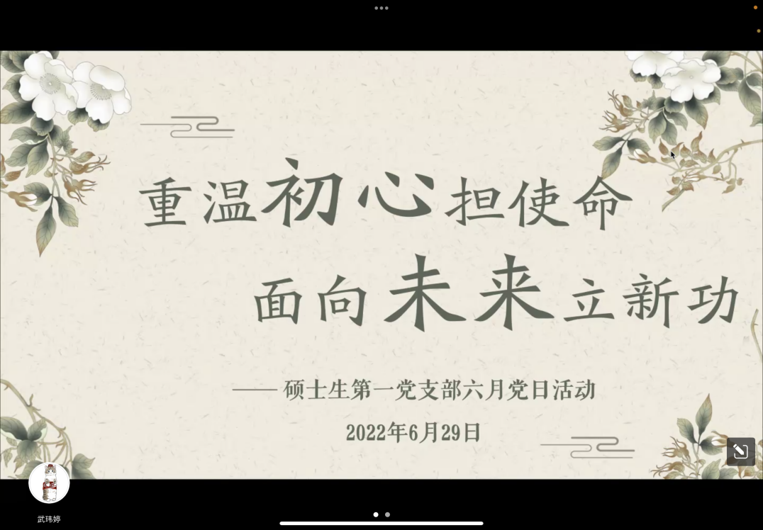 在中国共产党第二十次全国代表大会召开之年,在第101个建党节到来之际,2021级硕士生第一党支部于2022年6月29日晚七点开展“重温初心担使命,面向未来立新功”主题党日活动。通过聆听党员入党故事,重温入党初心,激励青年党员不负青春年华,牢记初心使命,接续奋斗,开创未来。