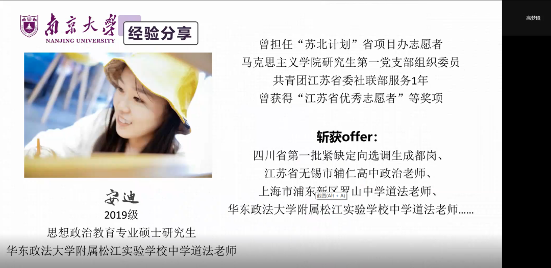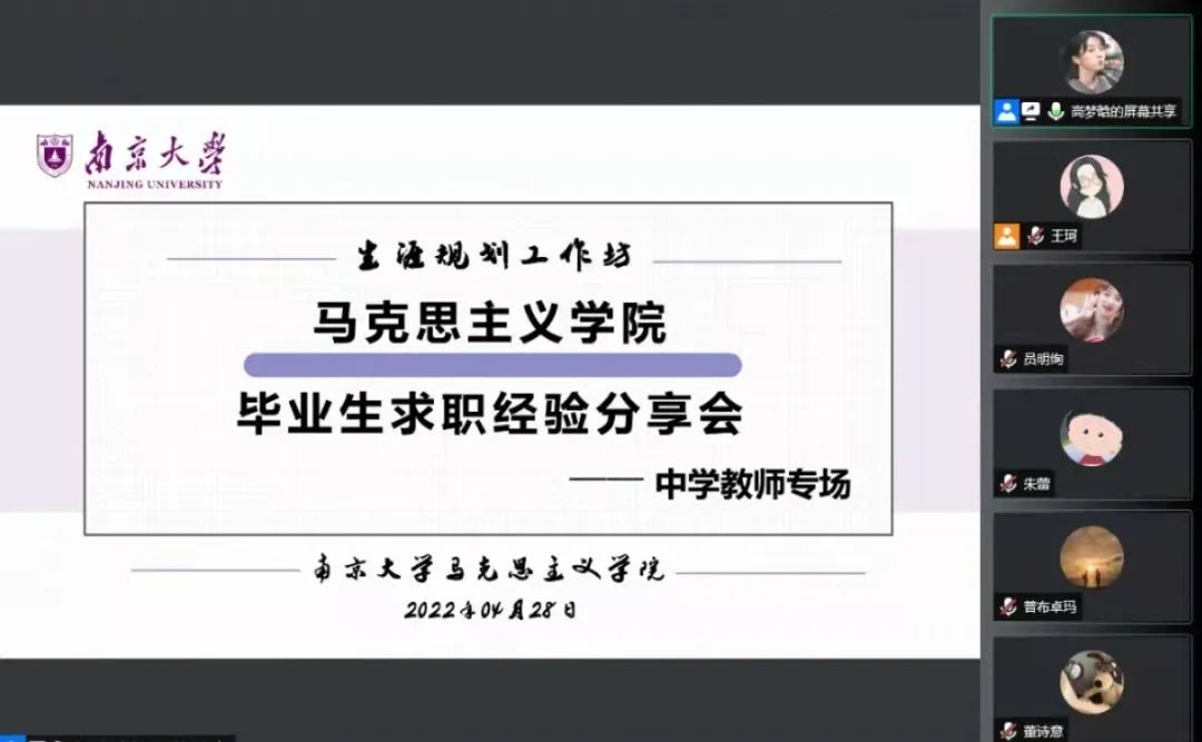 为帮助有志于从事教育工作的马院学子深入了解中学教师的职业特性,拓展选择视野与择业认知,明晰中学教师的准入条件与备考方向,2022年4月28日晚19点,马克思主义学院毕业生求职经验分享会之中学教师专场以在线会议的形式顺利举办。此次分享会共吸引来自各院系的50余名同学相聚云端,倾听学姐们选择中学教师职业的心路历程与经验分享。