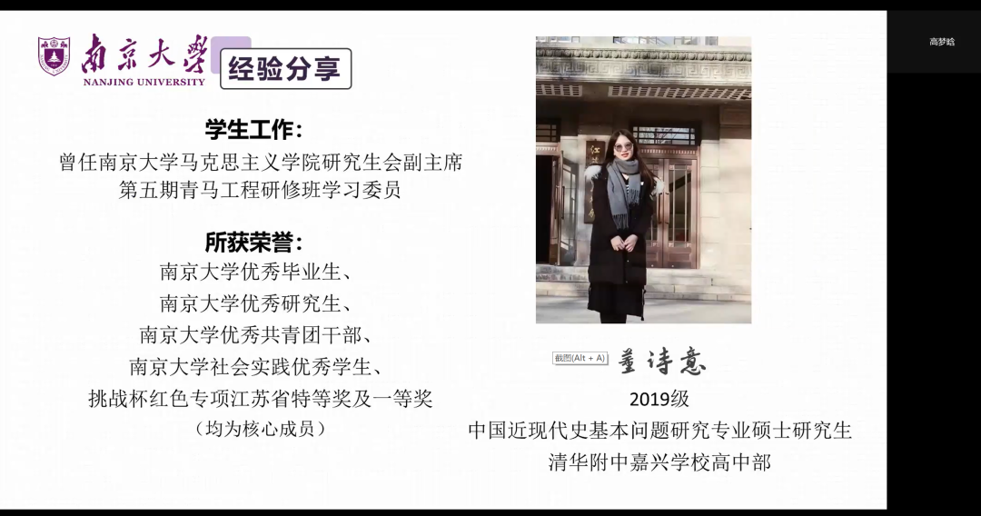2019级思想政治教育专业的安迪学姐和中国近现代史基本问题研究专业的董诗意学姐两位嘉宾进行分享。两位学姐从求职经历、心态转换、材料准备、面试技巧、人才引进渠道的教师招聘面试流程等多个角度将个人求职与备考经验向大家倾囊相授,并悉心提醒同学们勇于尝试多岗位,敢于应对多挑战,勤于练就真本领,从而在求职路上斩获offer,收获成长。
