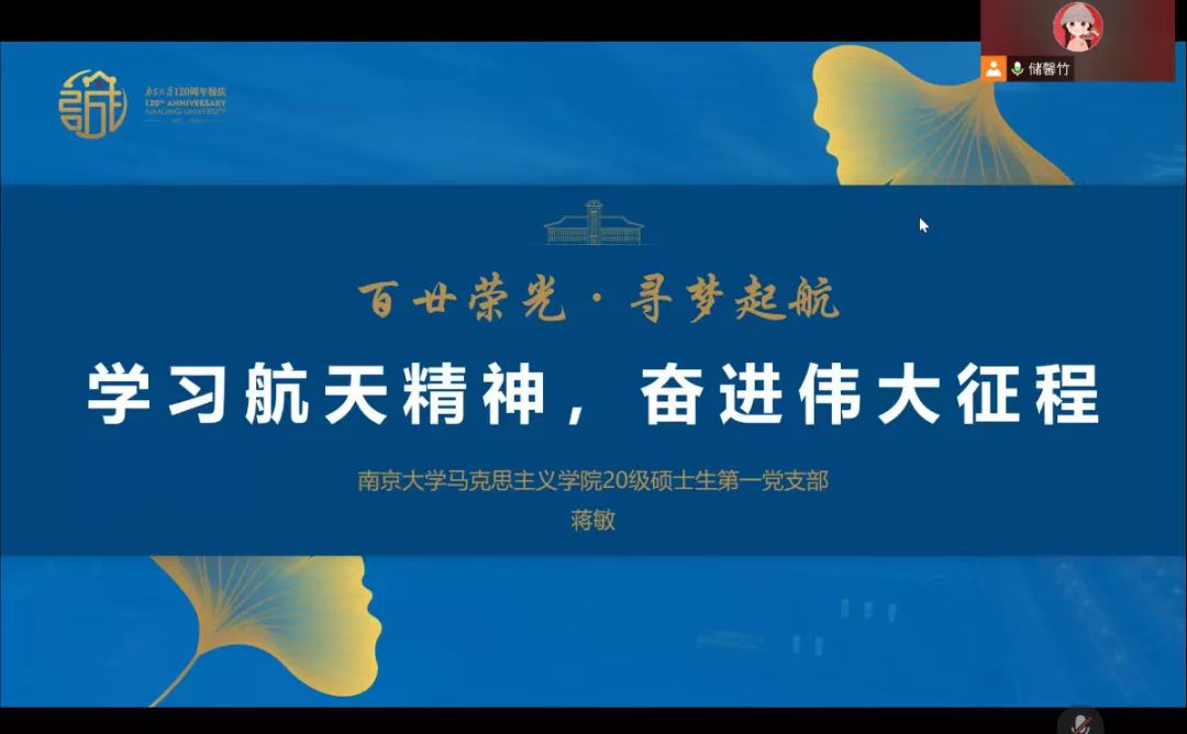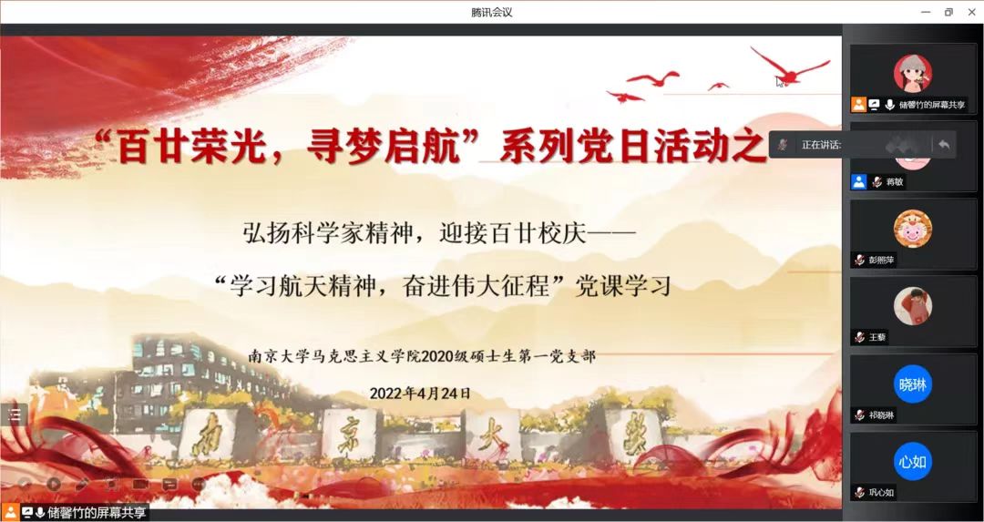 为喜迎南京大学120周年校庆,大力弘扬科学家精神,引导学生党员建言献策、贡献智慧、广泛参与、群策群力,传承南大精神、展现新风貌、彰显新成就。2022年4月24日晚19:00,南京大学马克思主义学院2020级硕士生第一党支部通过腾讯会议开展“百廿荣光·寻梦起航——弘扬科学家精神,迎接百廿校庆”线上主题党日活动,马院2020级硕士生第一党支部全体党员及入党积极分子参加此次活动。本次活动由马克思主义学院2020级硕士生第一党支部书记储馨竹主持,2020级硕士生第一党支部宣讲团讲师蒋敏带来了关于“学习航天精神,奋进伟大征程”的党课宣讲。