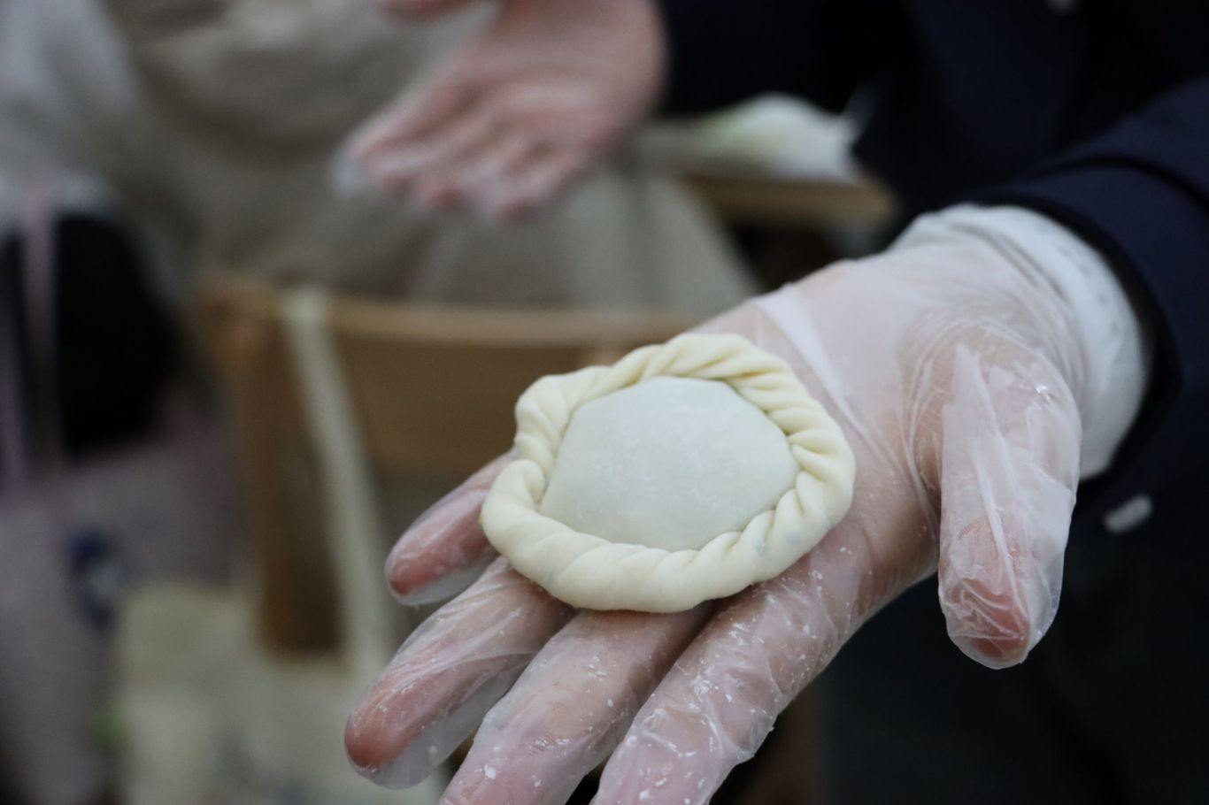 主持人热情开场之后,最令人期待的包饺子环节便正式开启。师生们洗净双手、戴上手套,柔软的饺子皮在指尖翻飞,鲜美的馅料被满满包裹——有的同学手法娴熟,筷子轻挑、指尖一捏,胖嘟嘟的元宝饺便整齐列队;有的同学初学乍练,慢慢将饺子皮边缘沾水、对折、捏合,虽偶尔有馅料 “探头探脑”,却也别有一番趣味;更有创意十足的同学将饺子捏成福袋形,寓意新岁纳福、好运满满。指尖流转间,真挚的心愿便捏成了具象的形状。