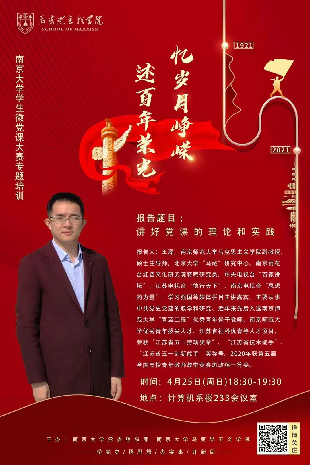经过精彩激烈的角逐,“忆岁月峥嵘,述百年荣光”南京大学学生微党课大赛院内初赛环节已落下帷幕,即将进入复赛环节。为了进一步加强大家对百年党史的学习领会,提升党课授课技能,校党委组织部和马克思主义学院于4月25日(周日)特安排了两场培训讲座,邀请专家名师进行专业辅导,帮助同学们打磨微党课作品,提升微党课质量。