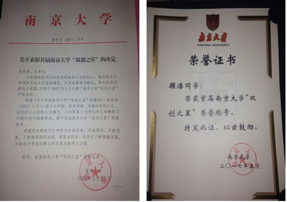 首届南京大学“双创之星”评选活动是为鼓励南京大学师生和校友积极参与创新创业,推进南京大学国家双创示范基地建设,促进成果转化孵化,营造校园创新创业氛围而设立的专项评选表彰活动。评选活动自5月初启动,先后经个人申报、院系审核、专家评审和公示,共评选出教师、学生、校友“双创之星”15人。此次顾浩成功当选首届南京大学“双创之星”,是继5月中旬荣获“第五届南京大学学生创业计划竞赛”一等奖后斩获的又一殊荣。