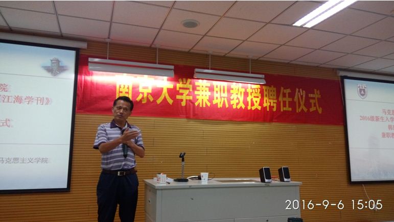 仪式第一项,由南京大学党委常委、宣传部院长、马克思主义学院院长王明生教授为韩璞庚教授颁发聘任证书,并合影留念。接着,韩璞庚教授上台发表任职讲话,韩教授首先对能够成为马院兼职教授表示荣幸,回顾了担任《江海学刊》主编以来与南大的深厚友谊,并结合自身的学术研究经历,与在场师生分享了学习研究应坚持的七大理念,包括学术理念、问题理念、策划理念、精品理念、原创理念、盲点理念和趋势理念,并对今后学生的学习研究提出了具体建议。最后韩教授也提出今后工作的设想和展望,争取为学院发展做出贡献,同时表达了对在场师生的美好祝愿。